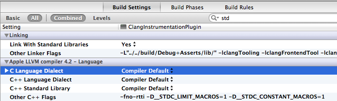 It is such a simple solution now but I was so sure that it was a problem in the internals of my LLVM build process that I managed to spend a whole morning getting very frustrated modifying the LLVM libraries when all I needed to do was Change those compiler settings!!